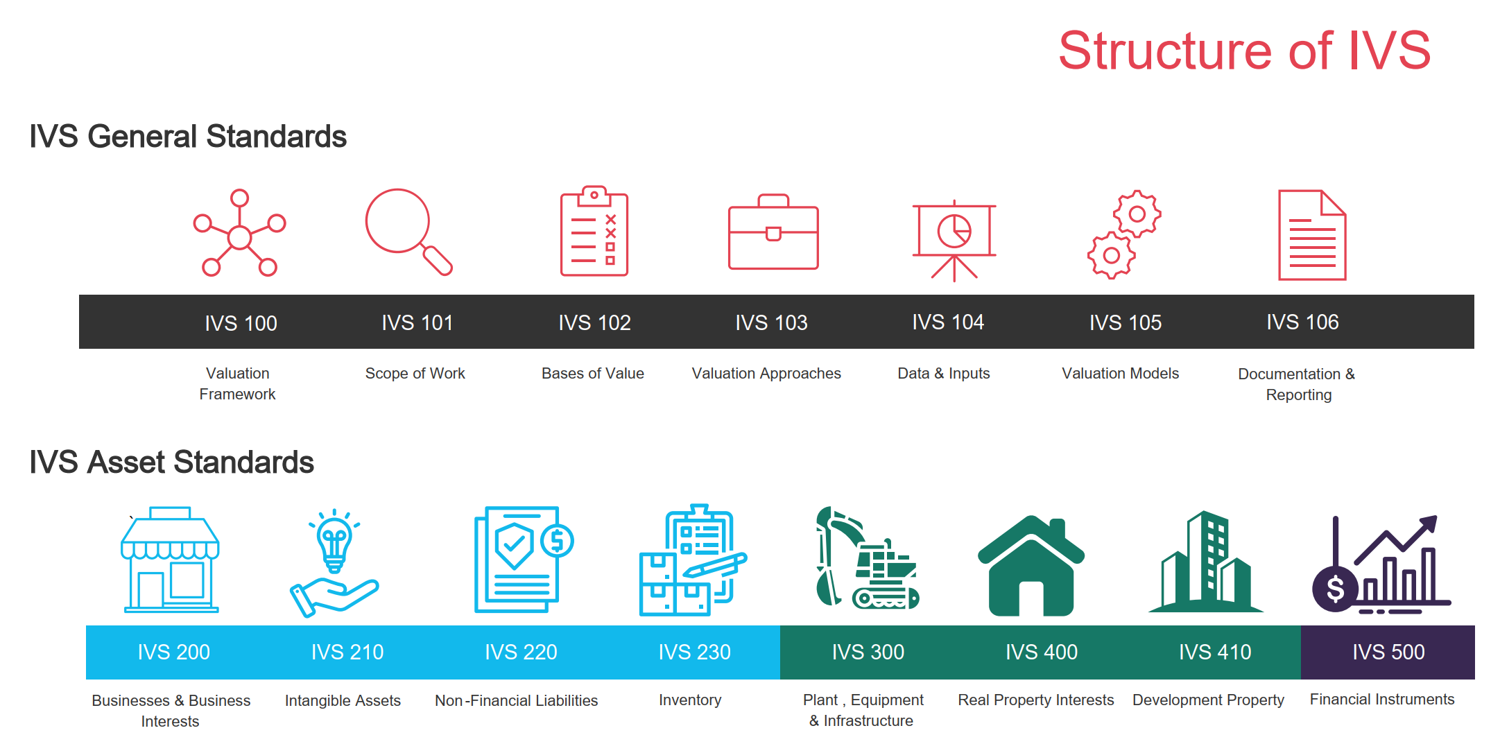 Nhóm Chuẩn mực chung đưa ra các yêu cầu đối với việc thực hiện tất cả các hoạt động liên quan đến thẩm định giá, bao gồm các điều khoản của hợp đồng thẩm định giá, cơ sở giá trị thẩm định giá, cách tiếp cận thẩm định giá, cơ sở dữ liệu đầu vào, mô hình thẩm định giá, tài liệu và báo cáo thẩm định giá.